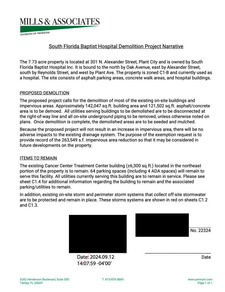 The document outlines the planned demolition of structures on a 7.73-acre property located at 301 N. Alexander Street, Plant City, owned by South Florida Baptist Hospital Inc. The property, currently zoned C1-B and used as a hospital, is bounded by Oak Avenue to the north, Alexander Street to the east, Reynolds Street to the south, and Plant Avenue to the west. The site includes asphalt parking areas, concrete walkways, and the main hospital buildings; as well as additional support infastructure.