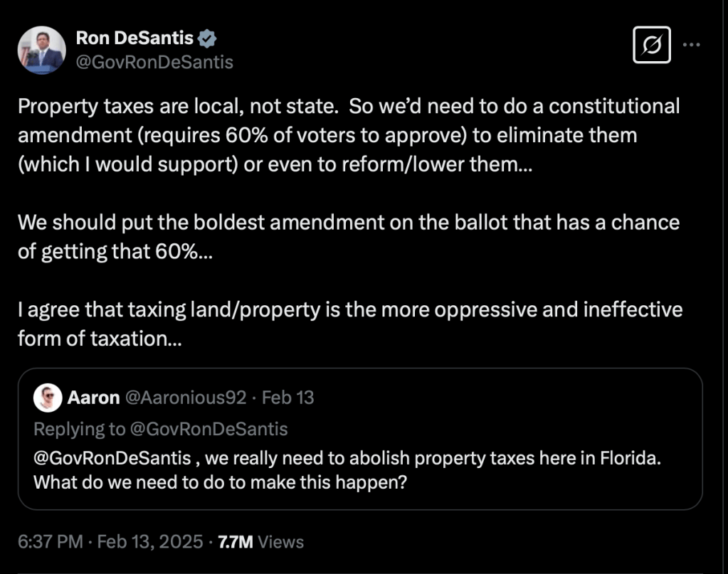 The governor first hinted at the possibility in mid-February on X, responding to a user advocating for the abolition of property taxes. “Property taxes are local, not state. So we’d need to do a constitutional amendment (requires 60% of voters to approve) to eliminate them (which I would support) or even to reform/lower them,” DeSantis wrote on February 13, 2025. He added, “We should put the boldest amendment on the ballot that has a chance of getting that 60%.” The post garnered significant attention, with Eric Trump amplifying it, declaring, “Florida leading the way! This is amazing!”