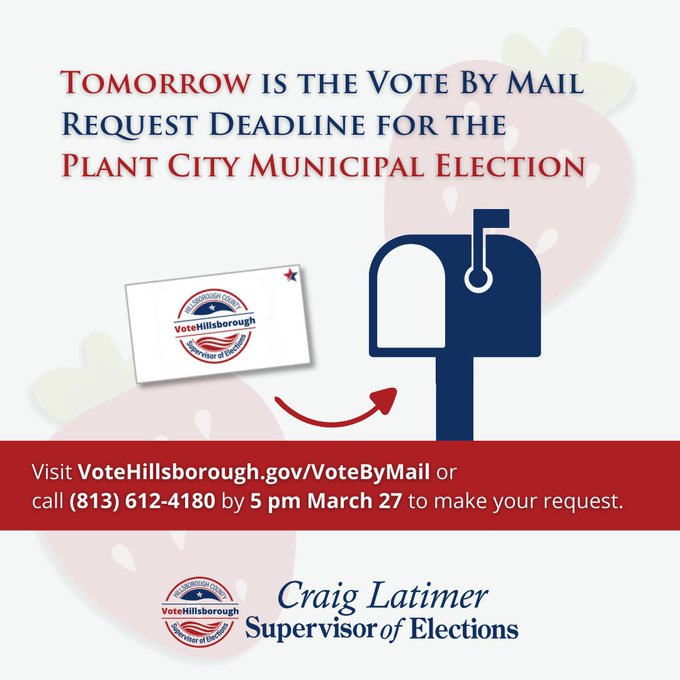 Attention Plant City Voters! The deadline to request a Vote By Mail ballot for the upcoming Plant City Municipal Election is today, March 27, by 5 PM. If you plan to vote by mail, now is the time to submit your request and ensure your voice is heard in this important election.