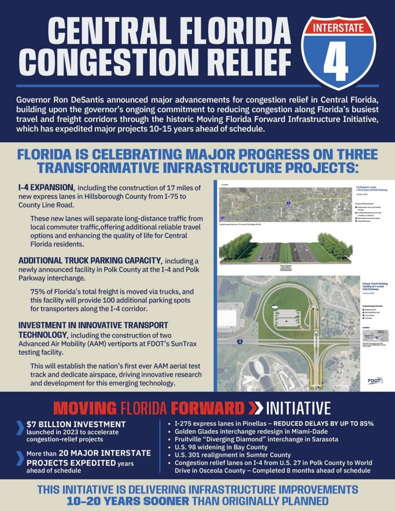 The Moving Florida Forward initiative reflects Governor DeSantis’ commitment to addressing infrastructure challenges head-on while preparing the state for future growth and technological advancements. By accelerating the I-4 toll lane project by a decade, adding critical truck parking capacity, and investing in advanced air mobility, Florida is taking bold steps to enhance connectivity, support economic development, and improve the quality of life for residents and visitors alike. The I-4 corridor, a vital link for tourism, commerce, and daily commuting, will benefit from these targeted improvements, ensuring it remains a reliable and efficient transportation network for years to come.